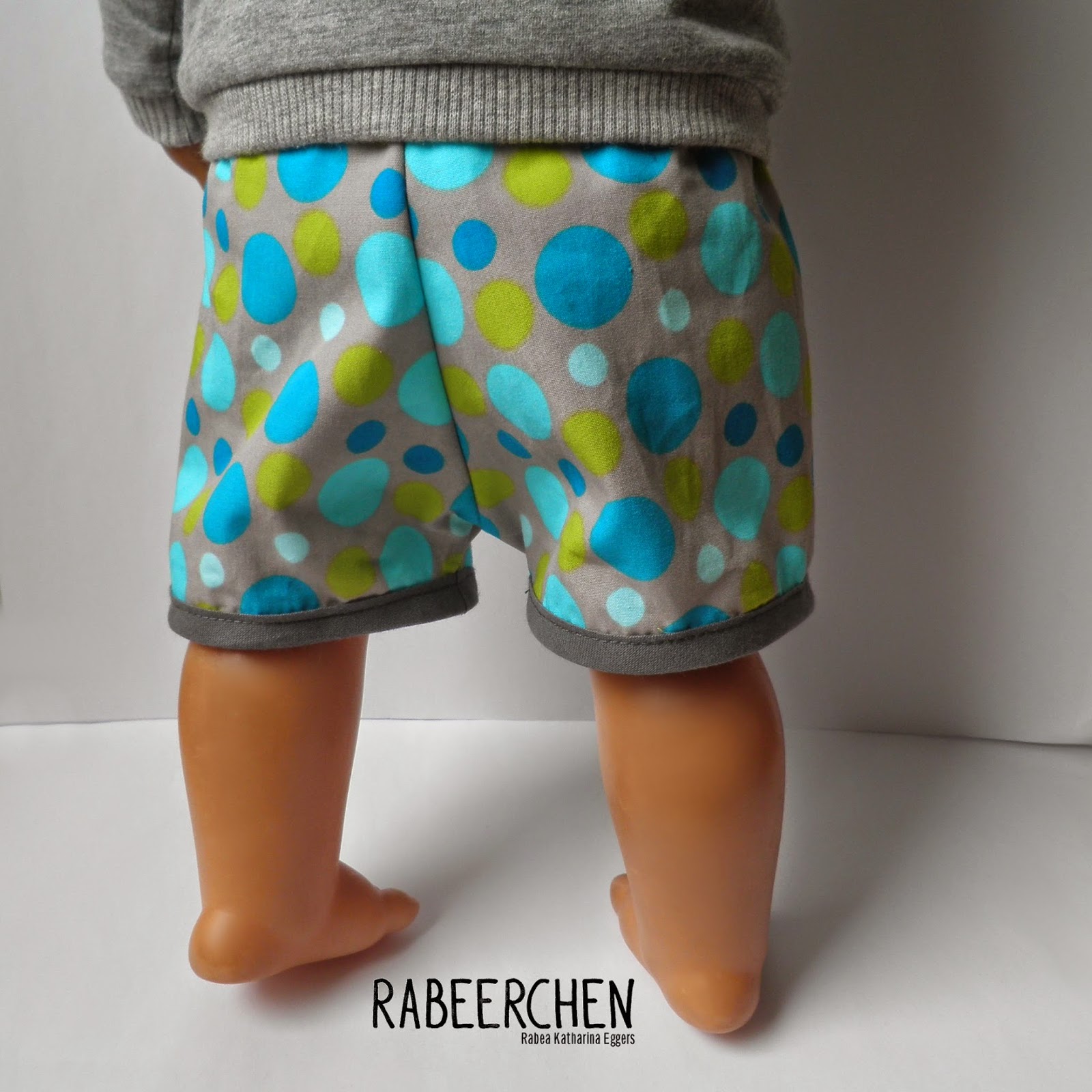 Die Jeansversion hat ein Bündchen inklusive Gummizug bekommen. Die gepunktetet zweite Variante wird aber so oder so nur sehr kurz getragen, so dass ich es mit einer Öse ausprobieren wollte. Für kleine Mini-Menschen würde ich aber nach wie vor zu einem breiten Jersey-Bündchen tendieren. Aber diese Version passt einer Puppe und von daher konnte die Öse einwandfrei getestet werden.