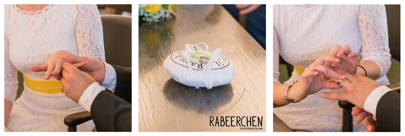 Ausnahmsweise zeige ich Euch hier noch schnell zwei andere Ringkissen, die ich nähen durfte. Das ist mir eine große Ehre gewesen, dass auf diesen beiden Hochzeiten ein Ringkissen von mir dabei war.
