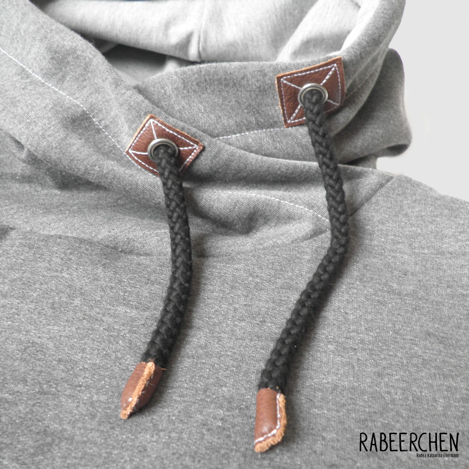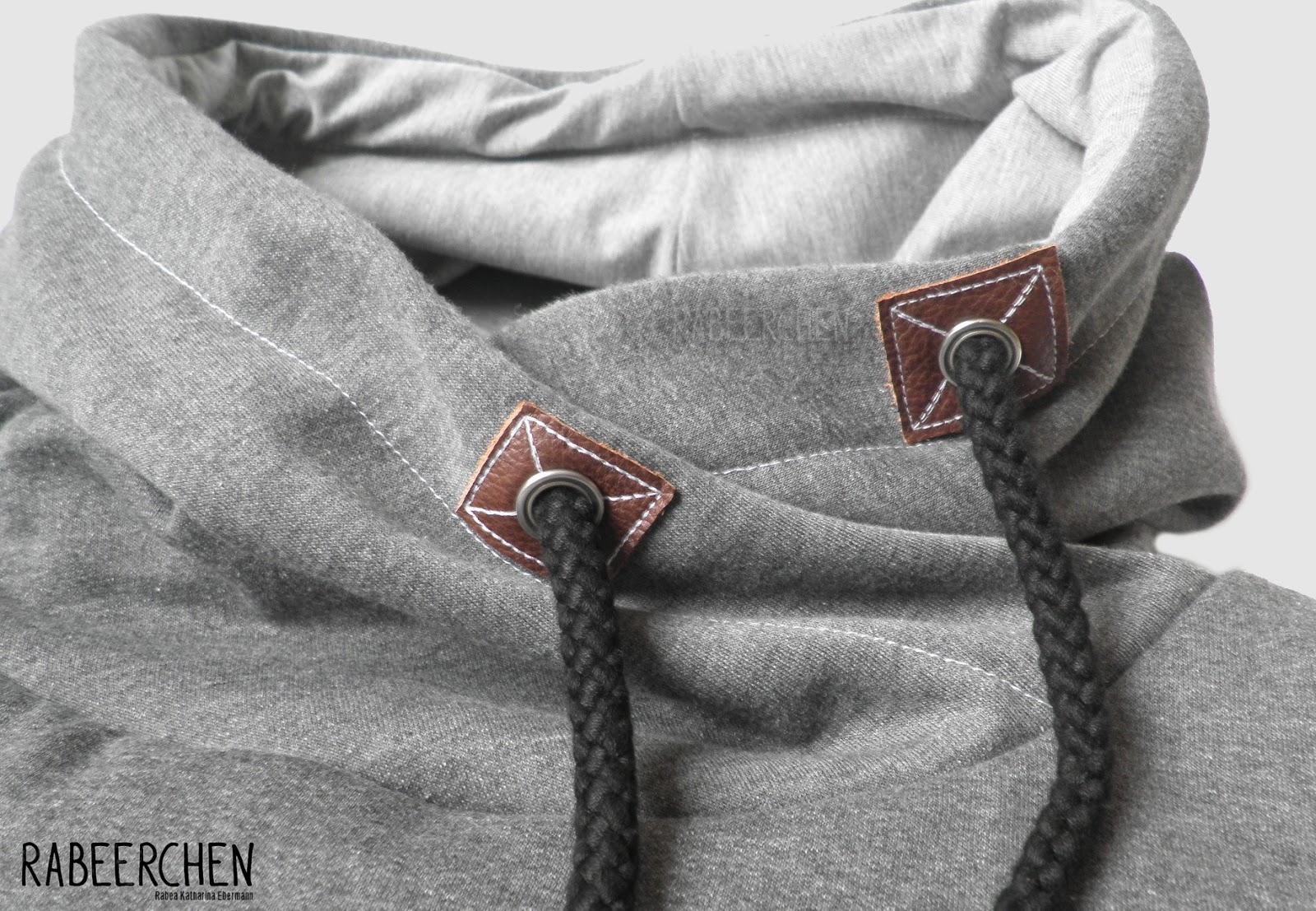 Der Kordelzug sollte etwas eleganter werden uns sich vom klassichen Hoddie absetzen. Gut das ich noch ein paar Lederreste zur Hand hatte. Das hat den Vorteil, dass die Ösen nicht ausreißen. Win-Win-Situation. Mit dem Schlaufenende hatte ich so meinen Ärger. Es gibt eine tolle Anleitung um die Enden ebenfalls mit dem Leder zu vernähen. Leider hat meine Nähmaschine sich in diesem Punkt verweigert und wir sind nicht auf einen Nenner gekommen. So habe ich die Enden mit der Hand genäht. Ohne Fingerhut natürlich! Autsch!