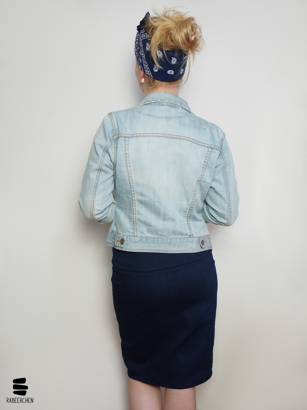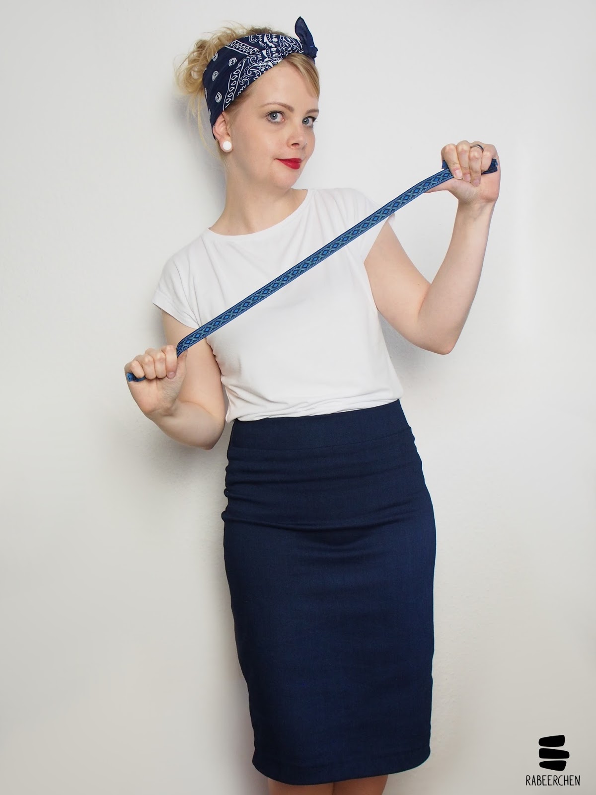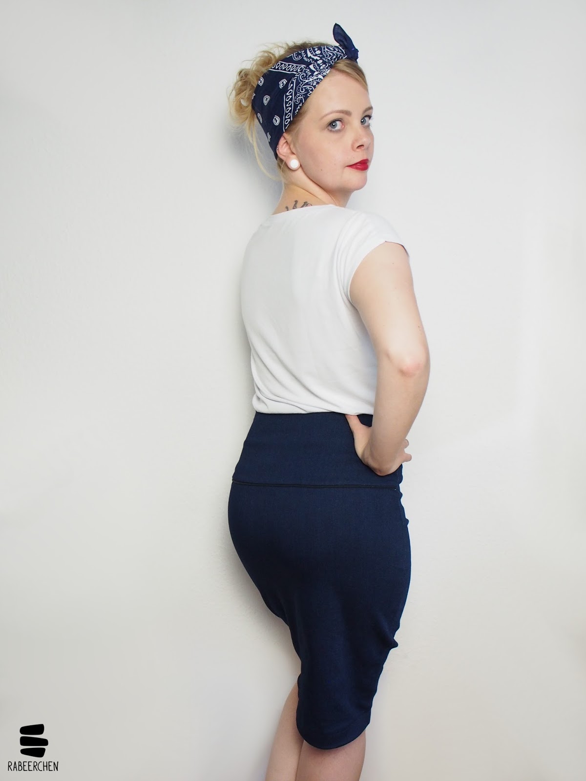 Kombiniert mit meinen Chucks wirkt Frau Tilda** wirklich ganz lässig. Ich kann sie mir aber auch gut mit roten Pumps vorstellen. Solche Schuhe finden sich allerdings nicht in meinem Besitz und so musste für den Pin-Up-Look wenigstens das Tuch herhalten. Wenn ich diese blaue Frau Tilda** sehe, dann sehe ich nämlich unweigerlich das selbstbewusste und mit sich zufriedene Pin-Up-Girl, von dem wir alle etwas in uns tragen sollten.