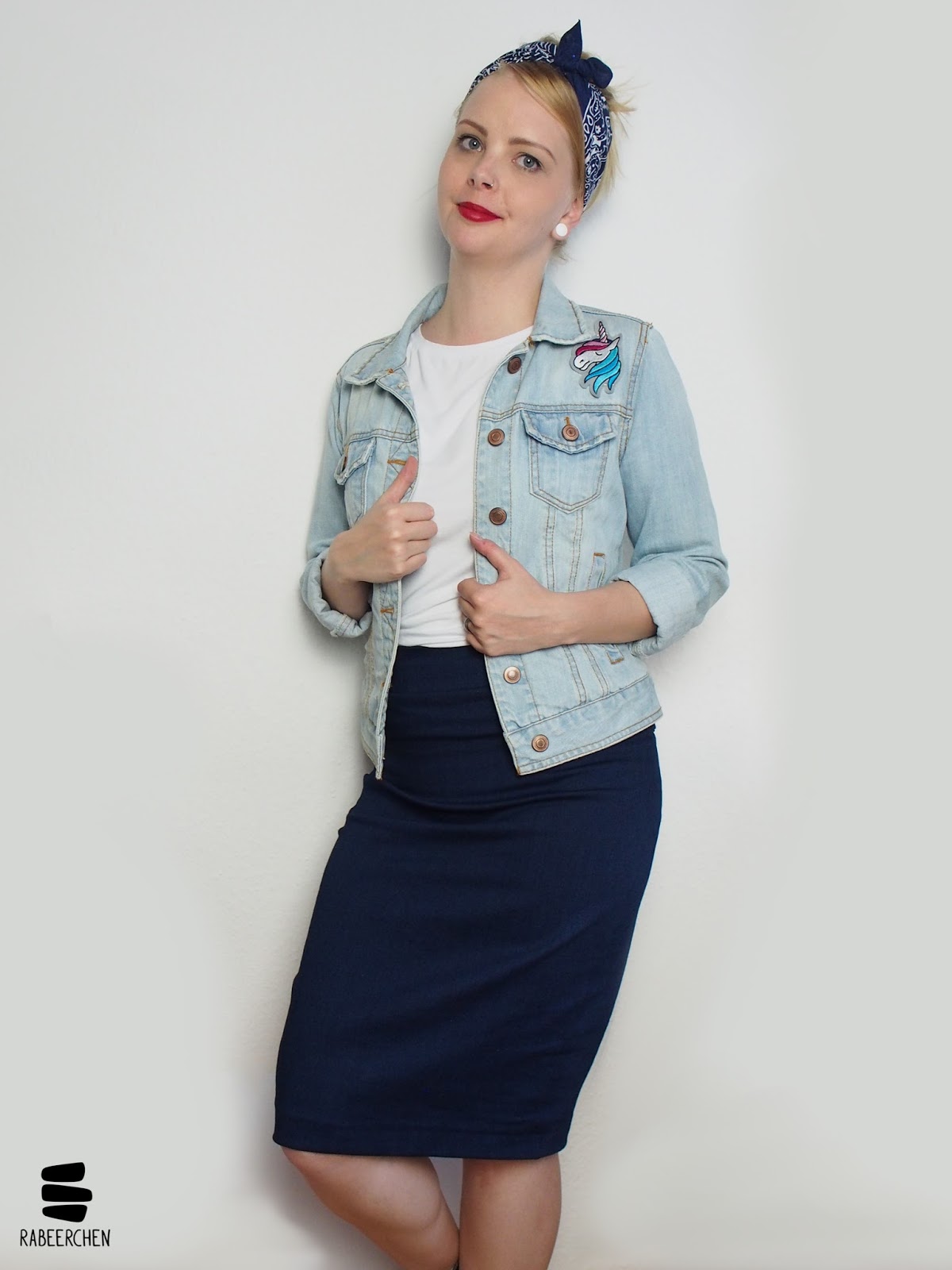Ich finde das Outfit mit dem schönen Blau, dem weißen Shirt und der Jeansjacke einfach nur perfekt. Würde ich mir genau so mopsen 😉