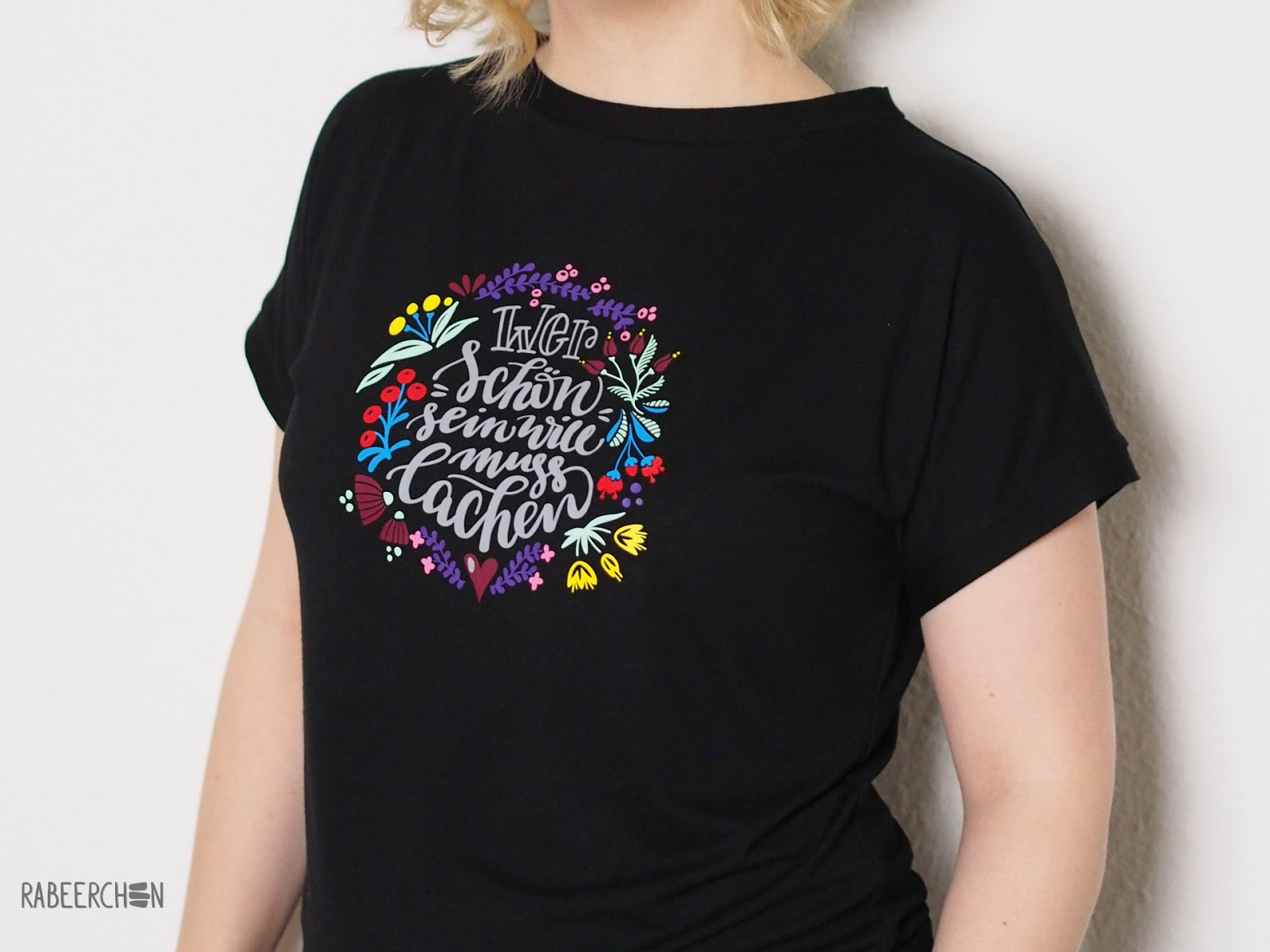 Das schwarze Basic T-Shirt aus Viskose ist ebenfalls selbstgenäht. Der Schnitt ist das T-Shirt von MariaDenmark, welches ich schon mehrfach genäht habe. Außerdem hätte ich diesen Plott niemals auf ein gekauftes, günstiges Shirt plotten können. Ich kann einfach nicht mehr lachen, wenn ich erahne unter welchen Bedingungen so ein Shirt produziert worden ist. Ich habe auf das kostenlose Schnittmuster zurückgegriffen, bei dem ich den Halsausschnitt verkleinert habe.